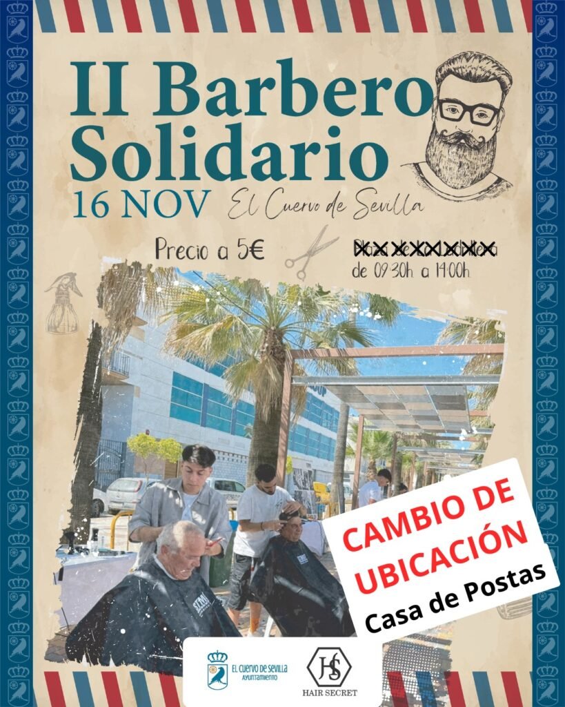 La organización del II Barbero Solidario anunció un cambio de localización para la jornada prevista el 16 de noviembre en El Cuervo de Sevilla. La modificación se debe a las previsiones de lluvia, que han llevado a trasladar la actividad a la Casa de Postas con el objetivo de garantizar su desarrollo en condiciones adecuadas.