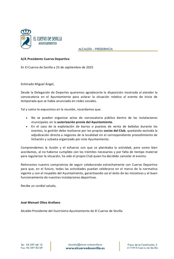 La decisión se produce tras un comunicado emitido por el Ayuntamiento de El Cuervo de Sevilla, que recordó al club la necesidad de contar con autorización previa para organizar actos de carácter público en instalaciones municipales. En la misma notificación se precisaba que, en el caso de barras o puestos de bebidas durante los eventos, la gestión corresponde únicamente a los socios de la entidad, quedando descartada la adjudicación directa a negocios externos sin procedimiento de licitación.