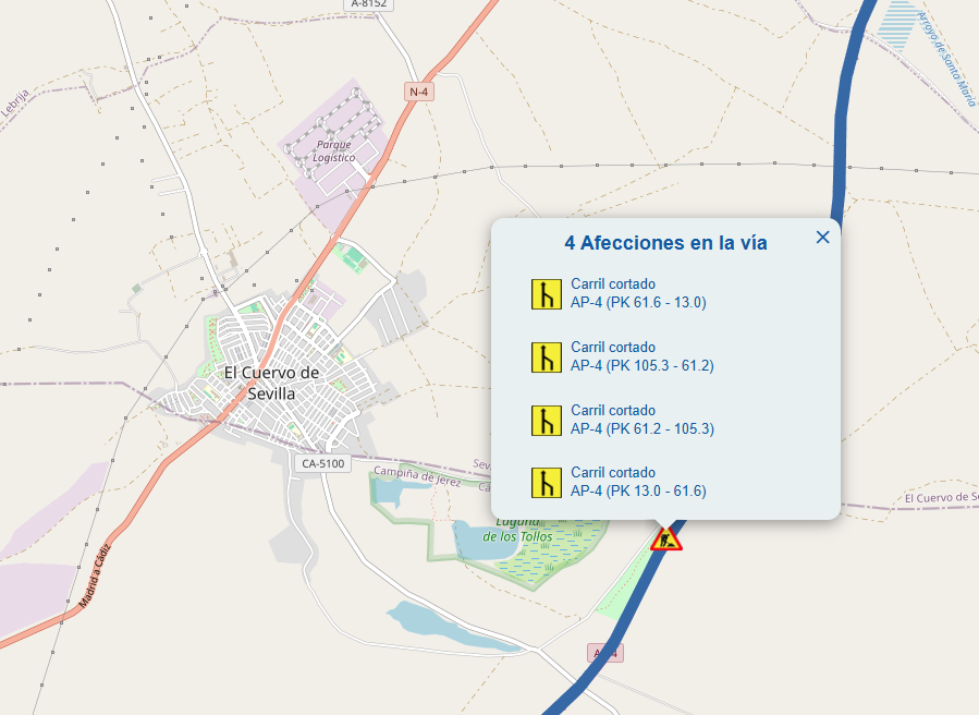 Todas las incidencias corresponden a cortes de carril, sin que se especifique la causa concreta de las restricciones ni su duración prevista. La información cartográfica sitúa los tramos afectados en las inmediaciones del término municipal de El Cuervo de Sevilla y zonas próximas de la provincia, en un eje viario que conecta distintos puntos del suroeste peninsular.