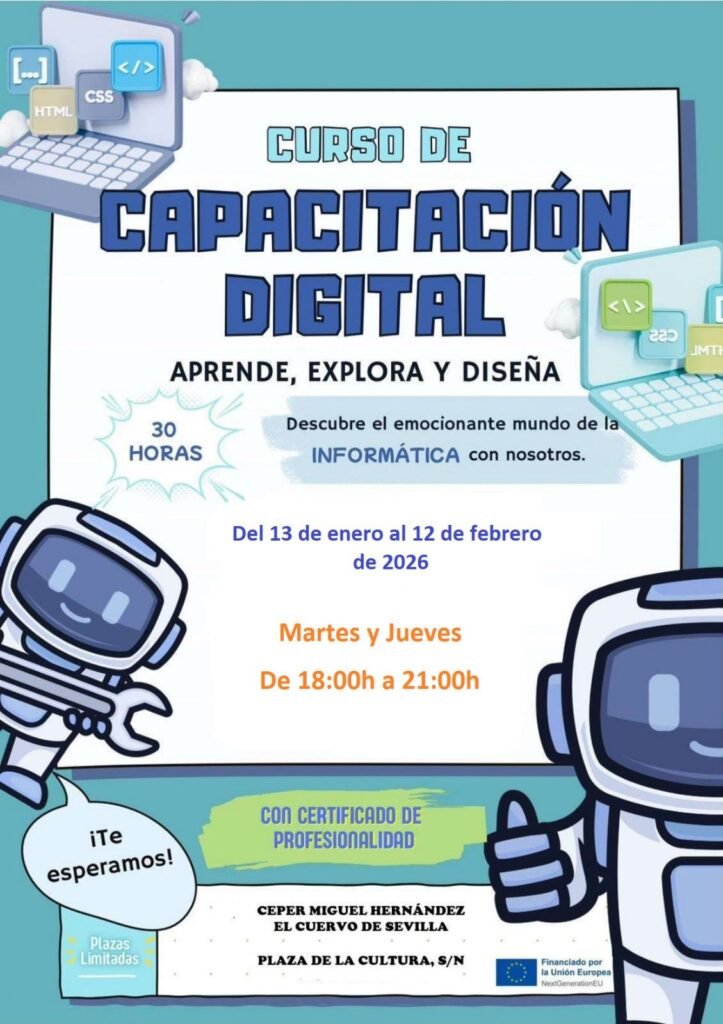 El Centro de Educación Permanente Miguel Hernández, ubicado en El Cuervo de Sevilla, ha anunciado la apertura de inscripciones para un curso de capacitación digital que se desarrollará entre el 13 de enero y el 12 de febrero de 2026. La iniciativa incluye un total de 30 horas formativas y está orientada a reforzar competencias básicas de informática mediante actividades de aprendizaje, exploración y diseño.