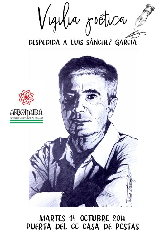 El Ateneo Cultural Andaluz Arbonaida ha convocado para esta tarde, martes 14 de octubre, a las 20:00 horas, una vigilia poética en memoria del escritor y poeta Luis Sánchez García. El acto tendrá lugar en la puerta del Centro Cultural Casa de Postas de El Cuervo y estará abierto a la participación de todas las personas interesadas.