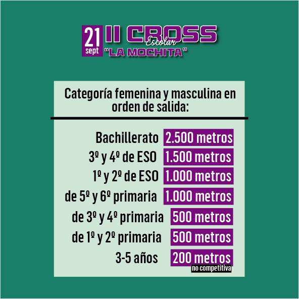 El evento contempla diferentes distancias según la edad del alumnado participante. Los estudiantes de bachillerato recorrerán 2.500 metros, mientras que los de 3º y 4º de ESO afrontarán 1.500 metros. Para 1º y 2º de ESO, así como para 5º y 6º de primaria, el recorrido será de 1.000 metros. Los grupos de 1º a 4º de primaria tendrán pruebas de 500 metros, y los niños de 3 a 5 años participarán en una carrera no competitiva de 200 metros.