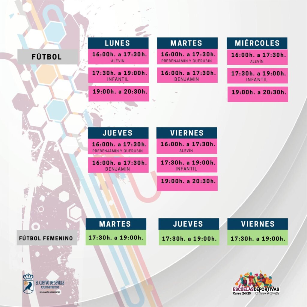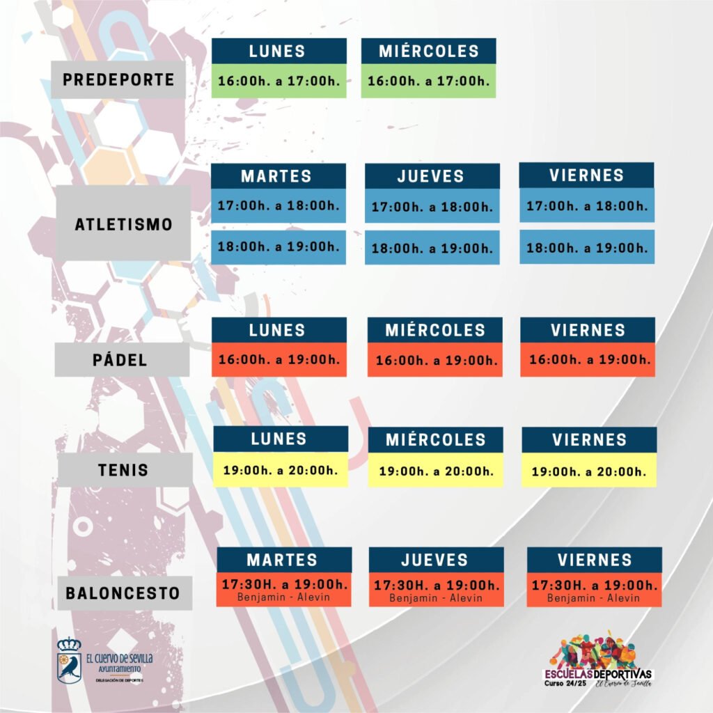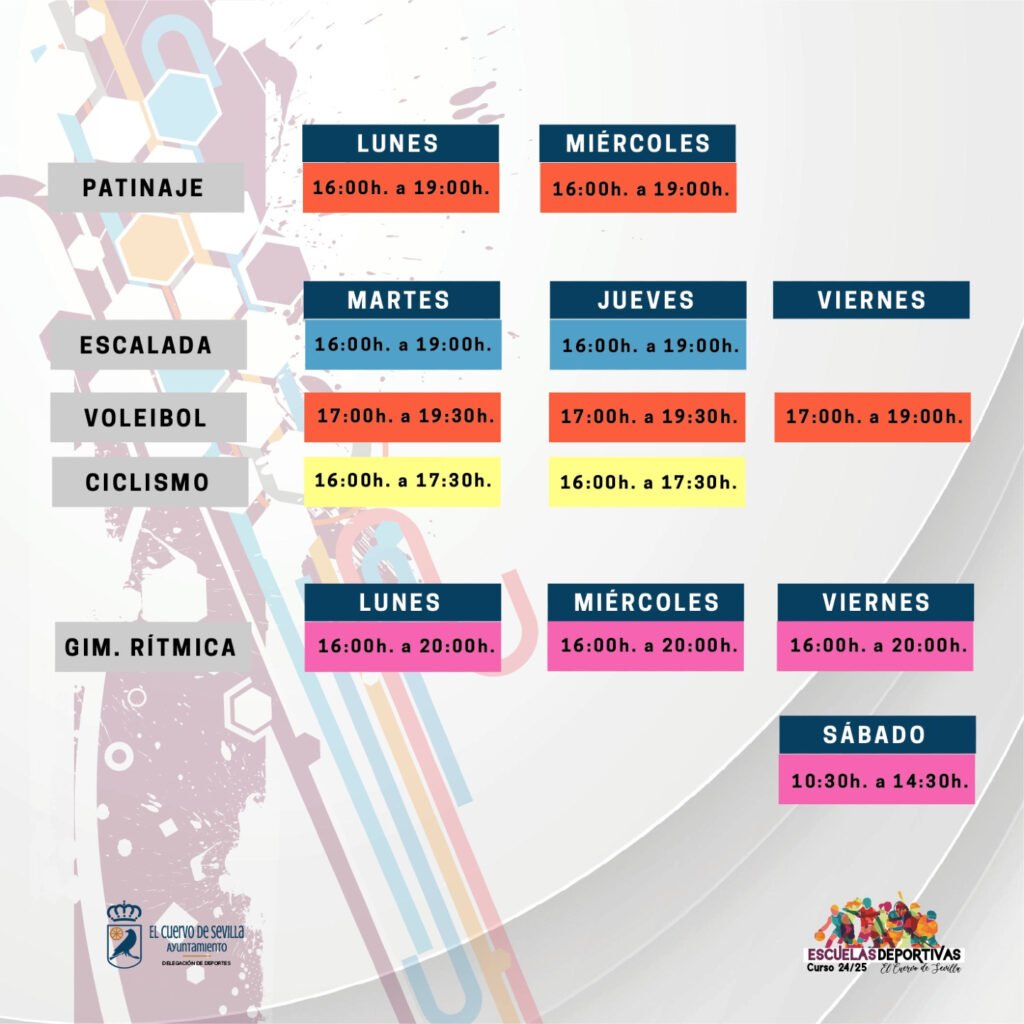 El Ayuntamiento de El Cuervo de Sevilla ha dado a conocer los horarios de las Escuelas Deportivas correspondientes al curso 2025-2026. La programación abarca un amplio abanico de disciplinas con sesiones repartidas de lunes a sábado.