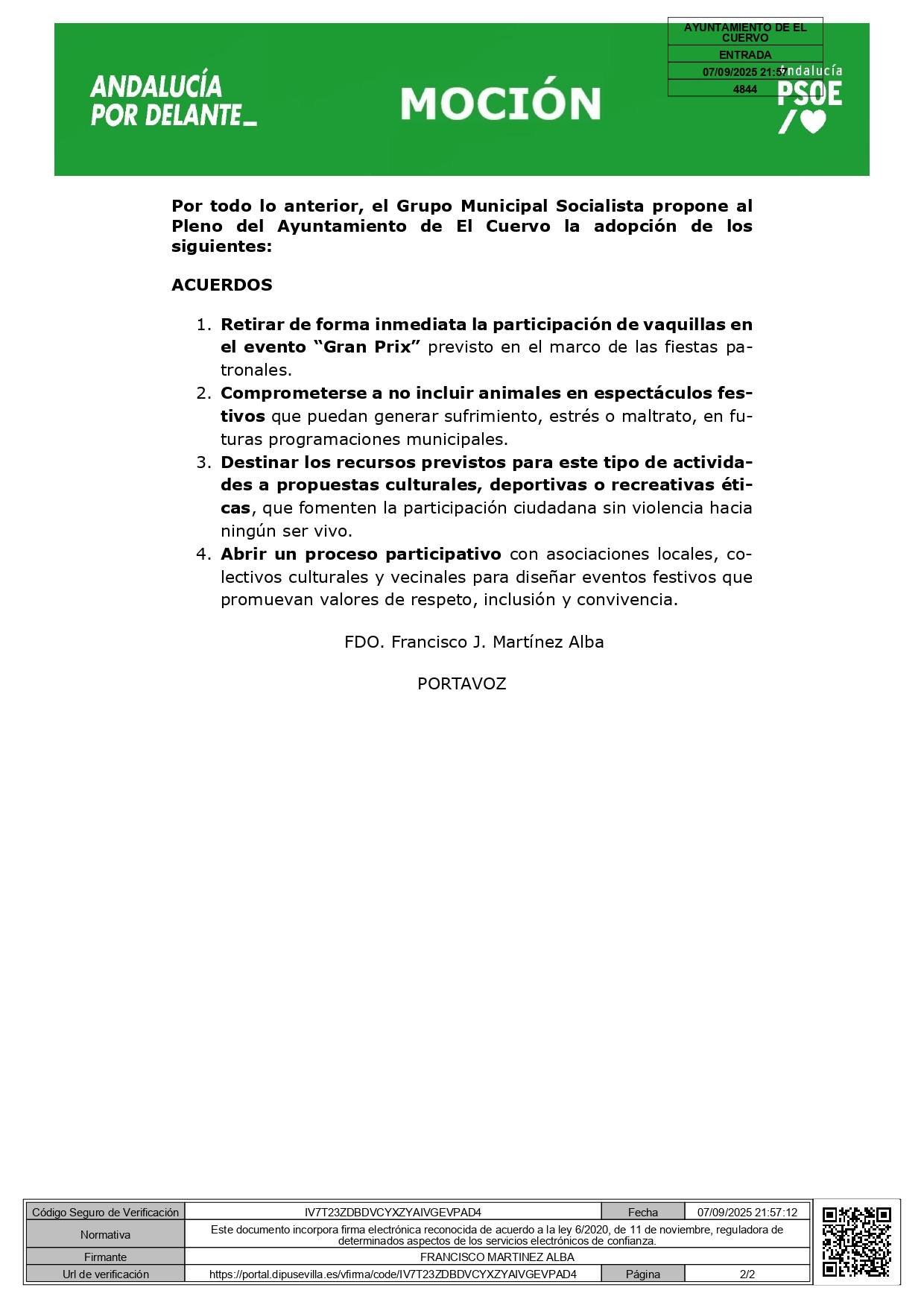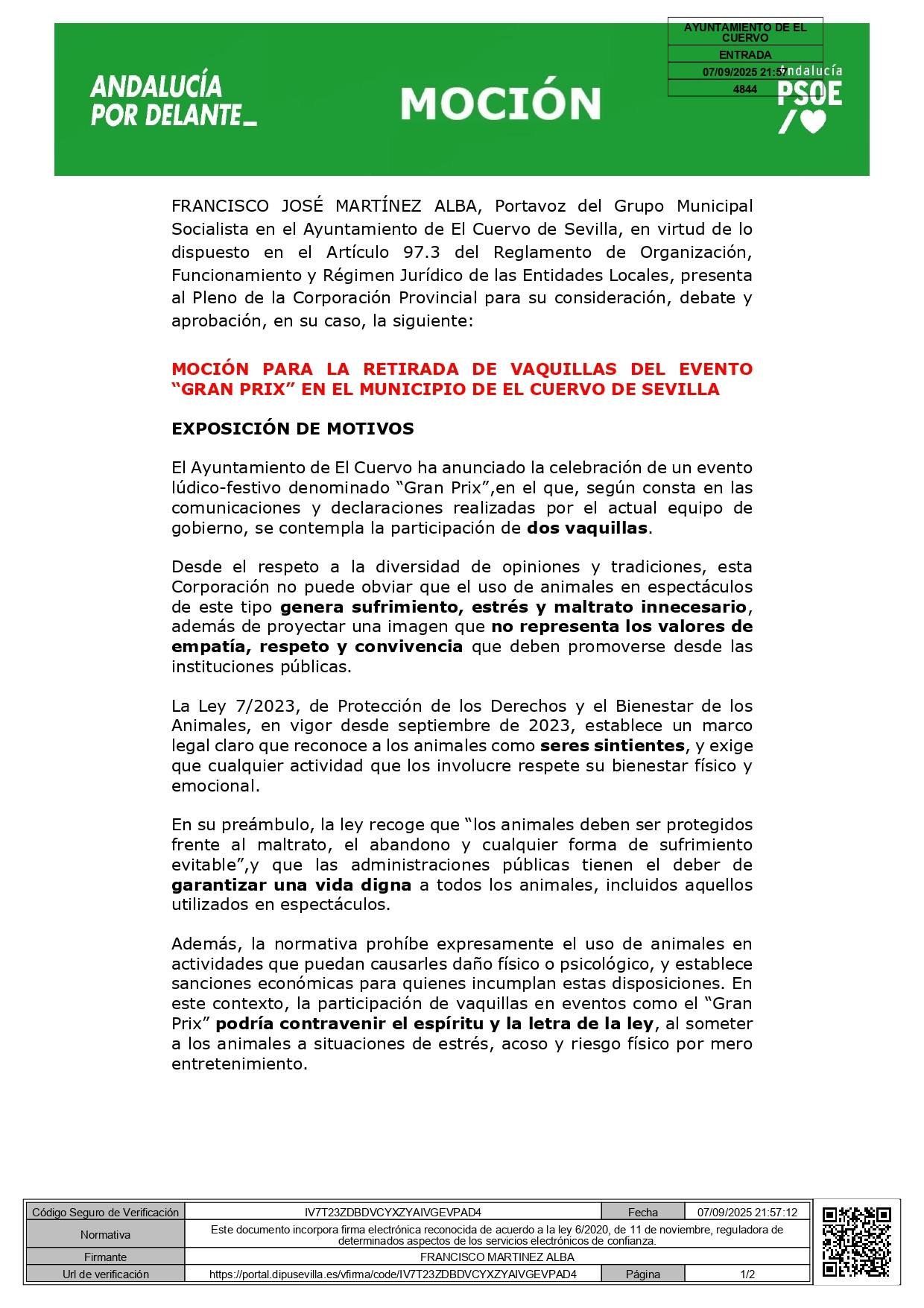 El Grupo Municipal Socialista de El Cuervo de Sevilla ha anunciado a través de un comunicado en su perfil oficial de Facebook, publicado a las 8:00 horas de hoy, 8 de septiembre, la presentación de una moción para debatirse en el próximo Pleno del Ayuntamiento, que tendrá lugar el próximo jueves 18 de septiembre, con el fin de retirar la participación de vaquillas en el evento “Gran Prix”, incluido en las fiestas patronales.