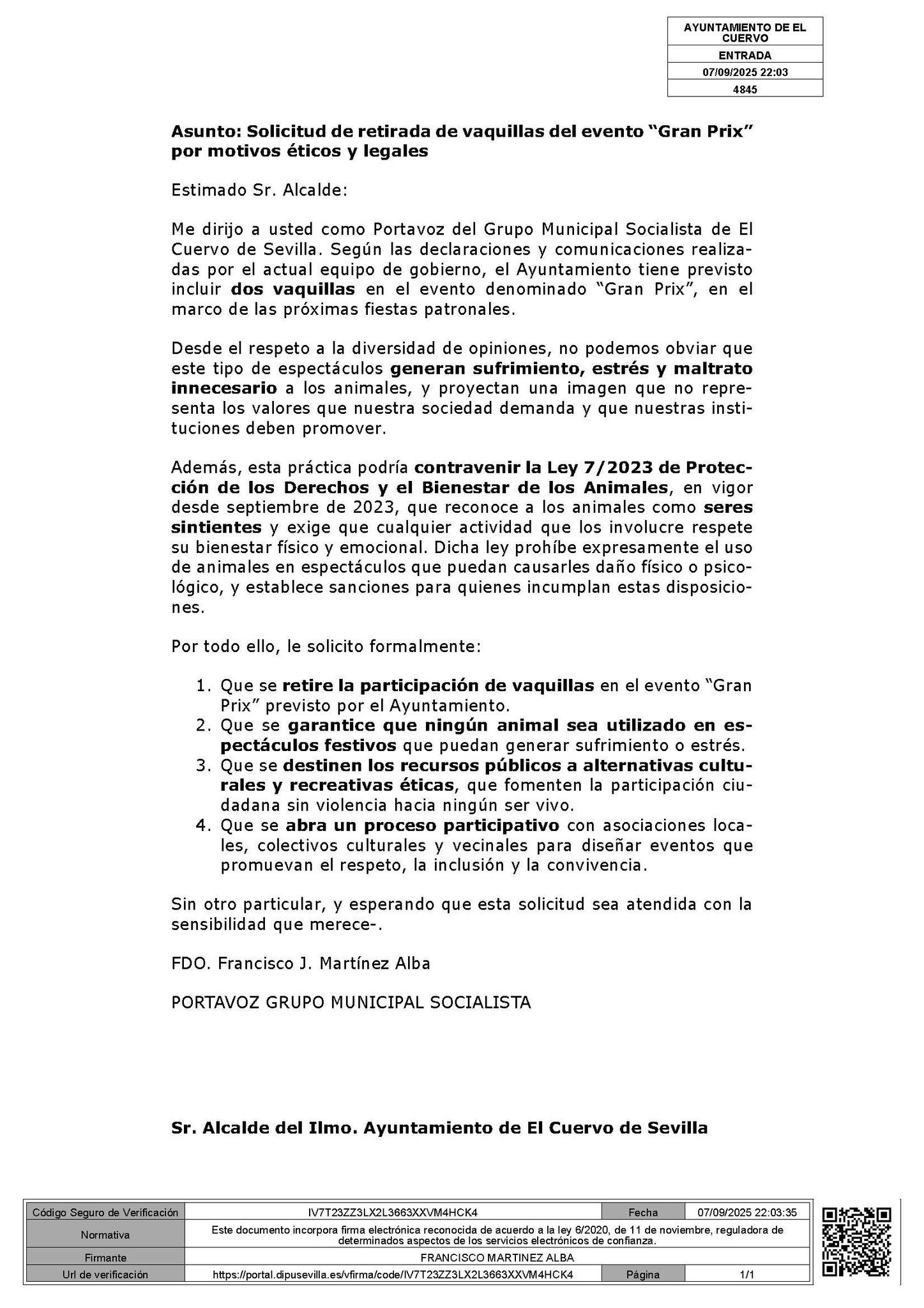 En la publicación, el PSOE local informa también del envío de un escrito al alcalde solicitando la supresión de los animales del espectáculo. La iniciativa se fundamenta en la Ley 7/2023 de Protección de los Derechos y el Bienestar de los Animales, en vigor desde septiembre de 2023, que reconoce a los animales como seres sintientes y prohíbe expresamente su participación en espectáculos que puedan ocasionarles daño físico o psicológico.